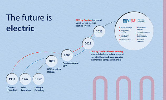 Actuellement, les marques Danfoss et DEVI by Danfoss sont présentes dans le portefeuille de chauffage électrique en France. Cependant, à partir du troisième trimestre 2025, tous les produits de chauffage électrique seront progressivement remplacés par leurs équivalents DEVI by Danfoss et consolidés sous la marque DEVI by Danfoss.